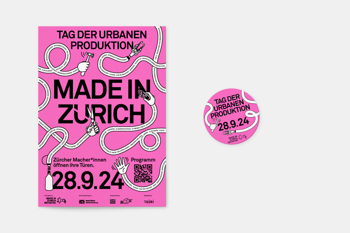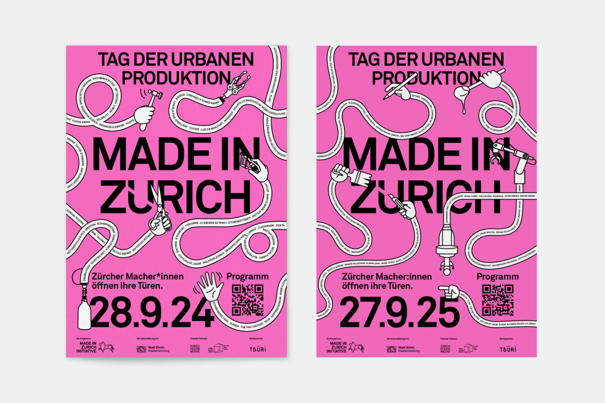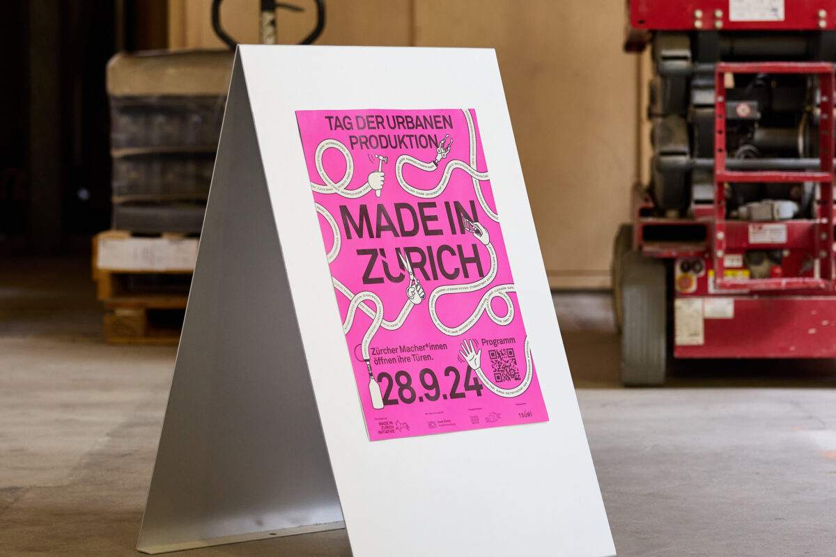 Im Auftrag von Made in Zürich entwickelten wir 2025 zum zweiten Mal das Key Visual, das in Trams, im Kino und auf Social Media zu sehen ist. Am Tag selbst weisen Plakate, Luftballons und Klebeband in leuchtendem Pink den Weg zu Manufakturen, Brauereien, Schmuck- und Modeateliers, zu Kaffeemaschinen- und Taschenherstellern und sogar in eine Käserei mitten in der Stadt.