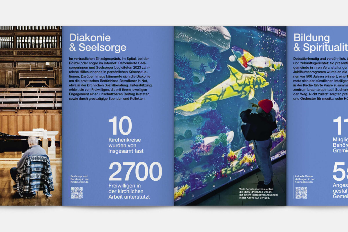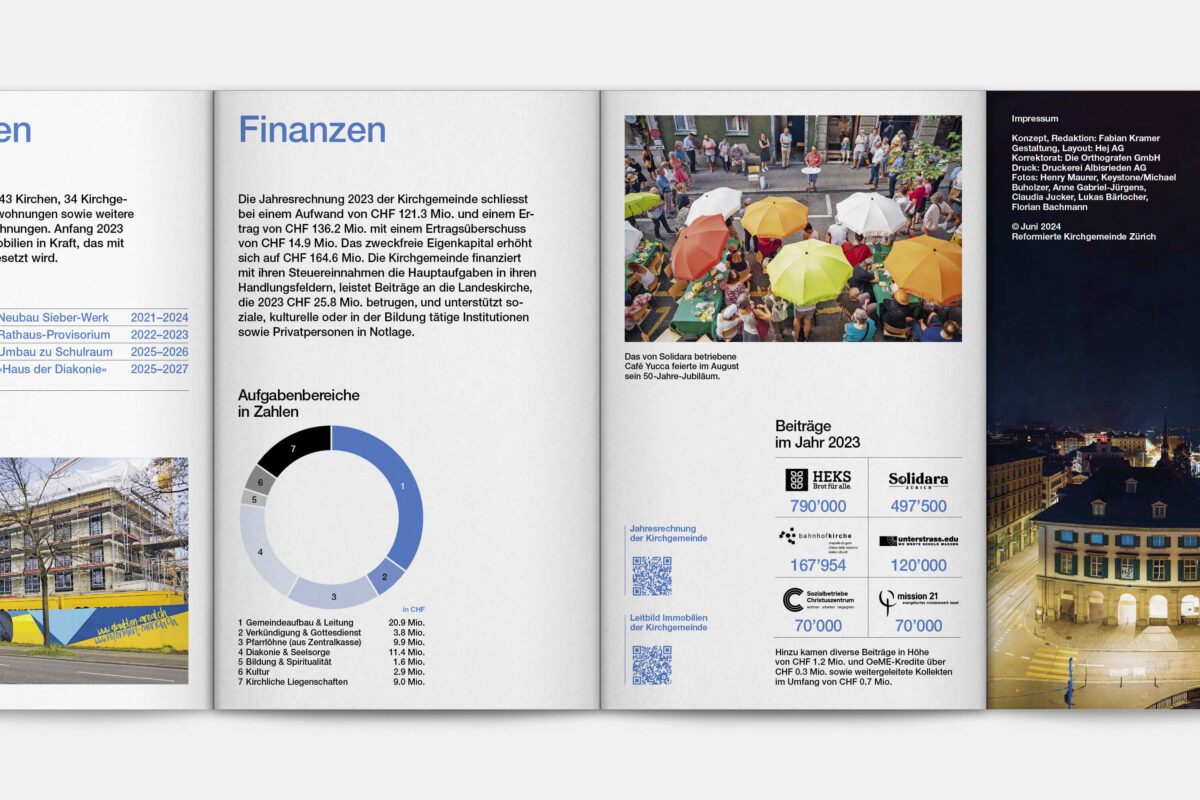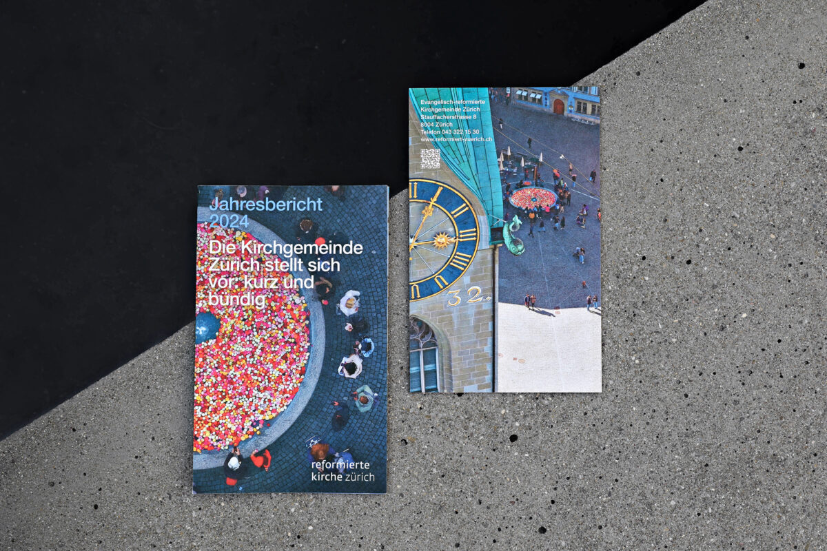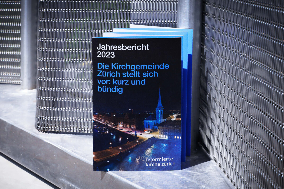 Der gedruckte Jahresbericht 2023 der Reformierten Kirche Zürich erscheint in der Form eines Leporellos. Kompakte Texte kombiniert mit fotografischen Impressionen, ausgewählten Kennzahlen und Infografiken vermitteln das Wichtigste in Kürze. Weiterführende Informationen zu den Legislaturzielen der Kirchenpflege, zur Jahresrechnung und die Jahresberichte der zehn Kirchenkreise sind online verfügbar.
