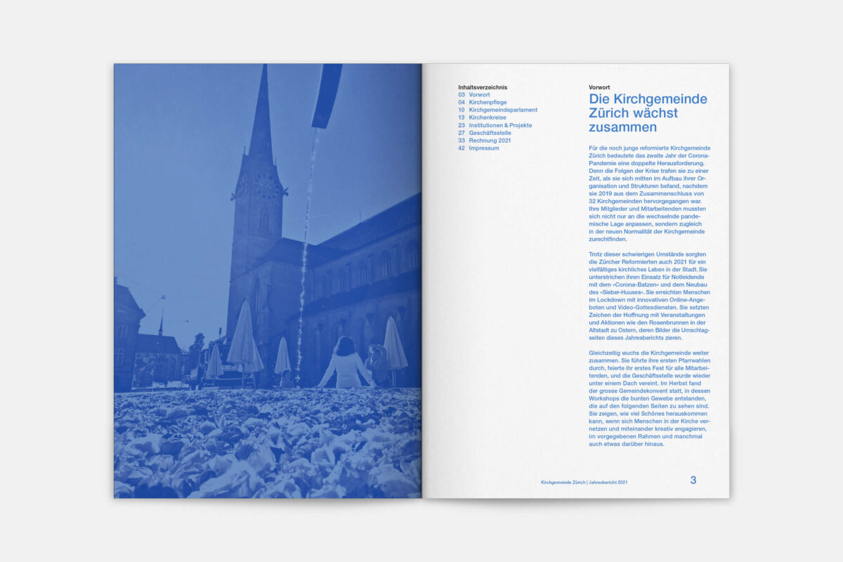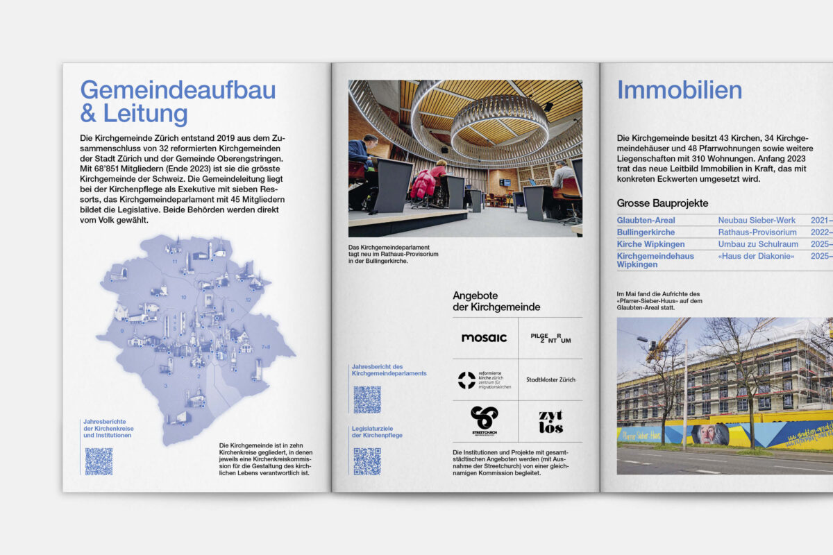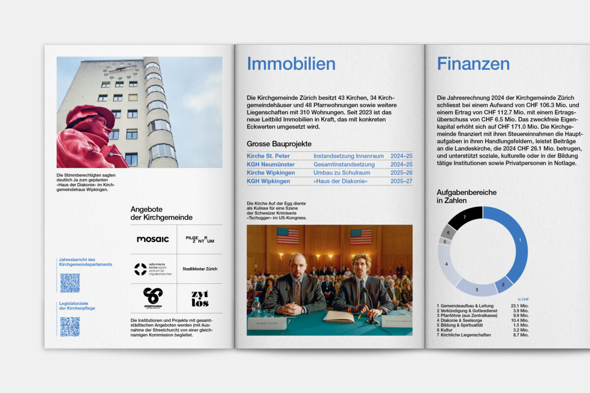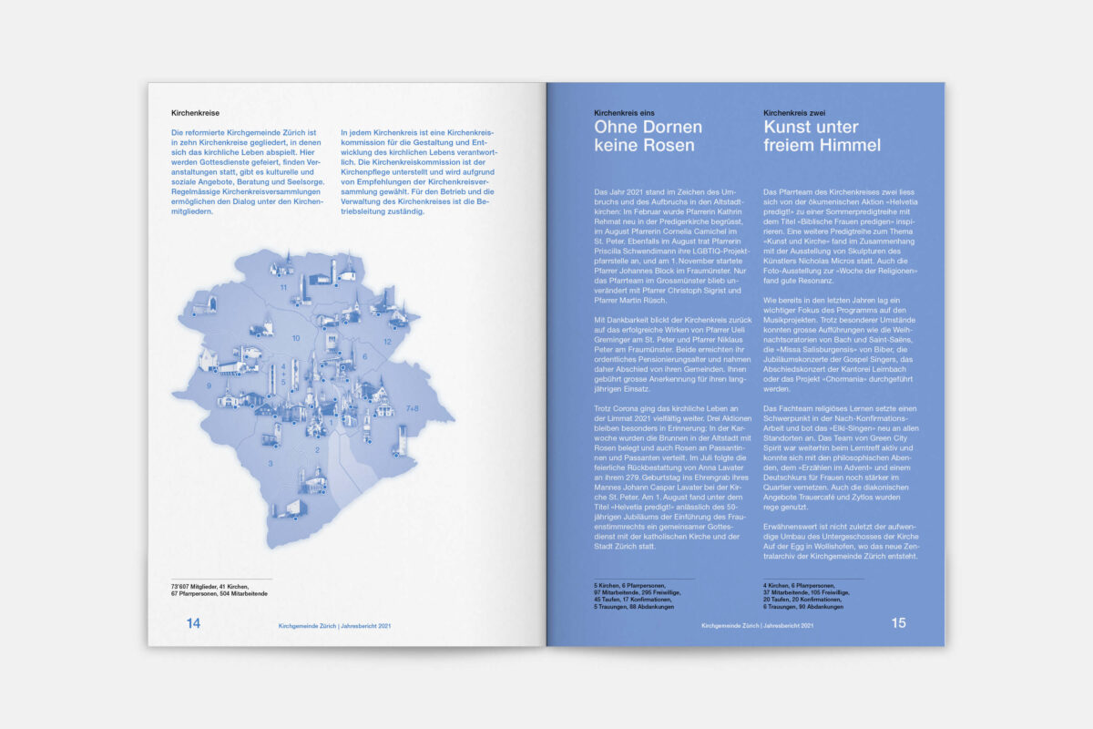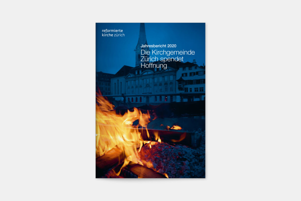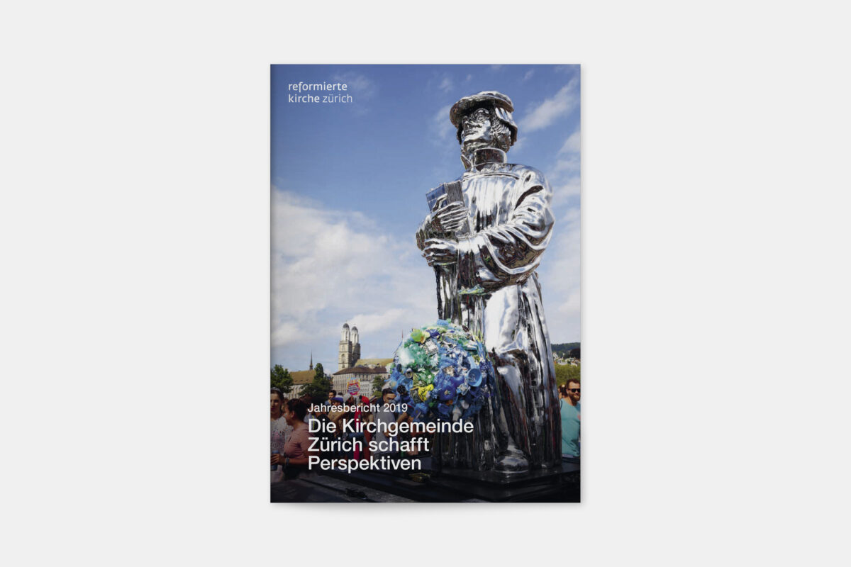 Für die Reformierte Kirche der Stadt Zürich war 2019 ein historisches Jahr. 500 Jahre nach dem Amtsantritt des Zürcher Reformators Ulrich Zwingli wurden die 32 Kirchgemeinden zu einer grossen Kirchgemeinde mit 12 Kirchenkreisen und fast 80’000 Mitgliedern zusammengelegt. In diesem Zug haben wir den Jahresbericht visuell neu konzipiert. Die Publikation lebt von einer typografisch klaren, offenen und zeitgemässen Gestaltungsanlage. Illustrationen der 41 Kirchen und Projekteinblicke aus den Kirchenkreisen vermitteln einen Eindruck der Vielfalt der neuen Kirchgemeinde Zürich.