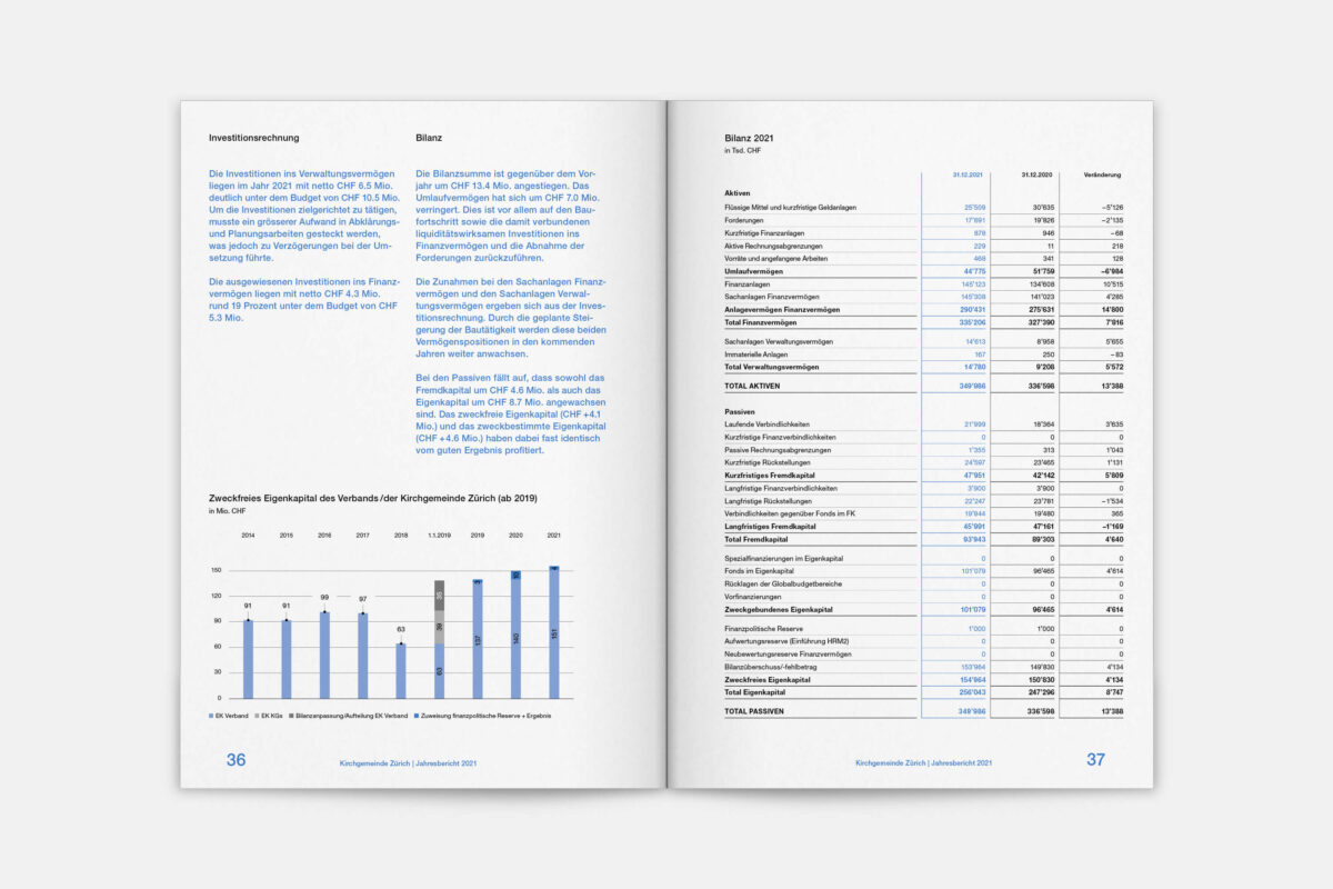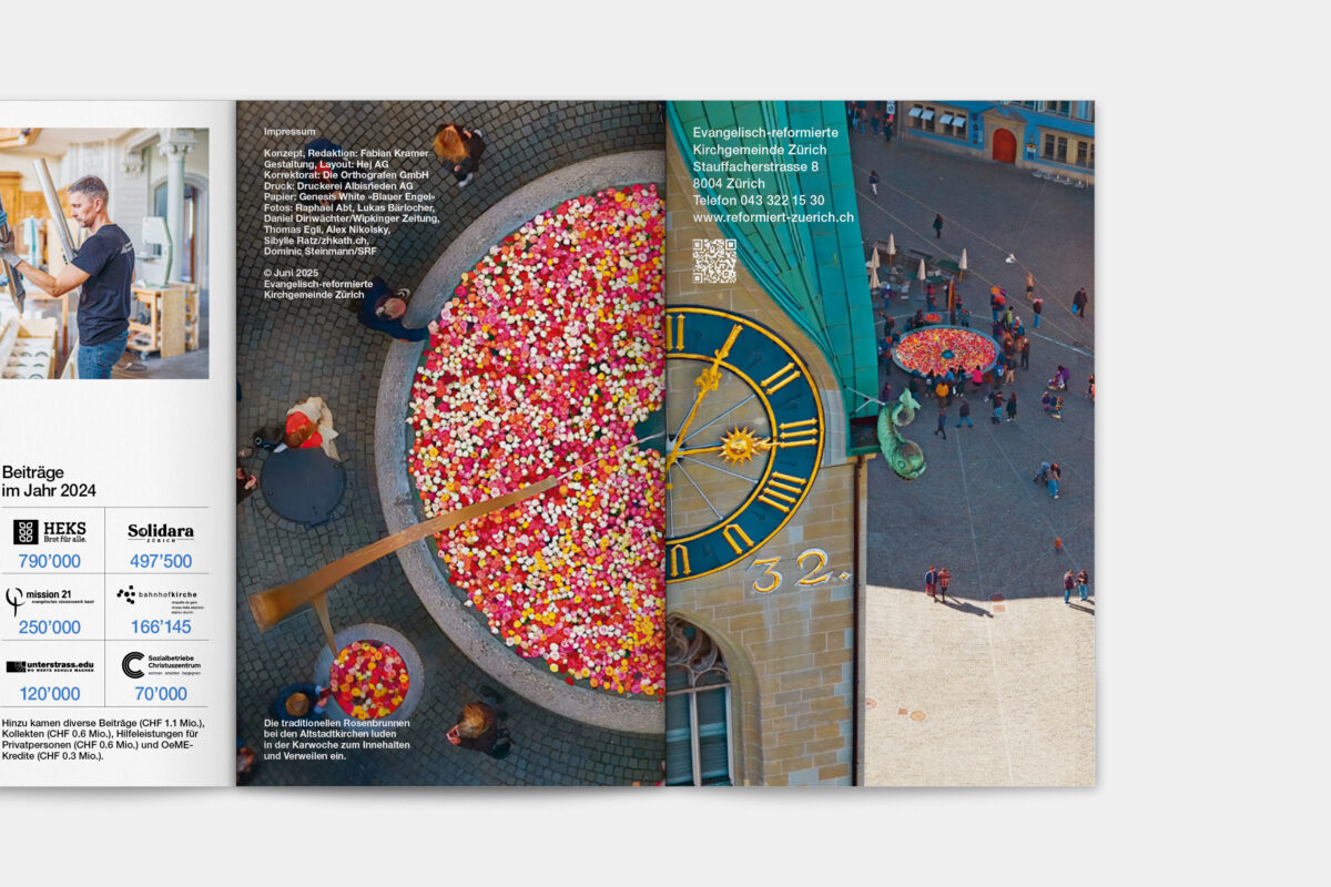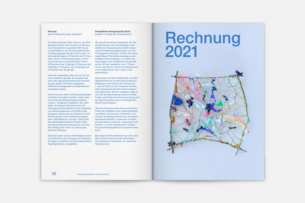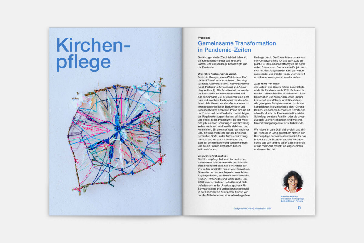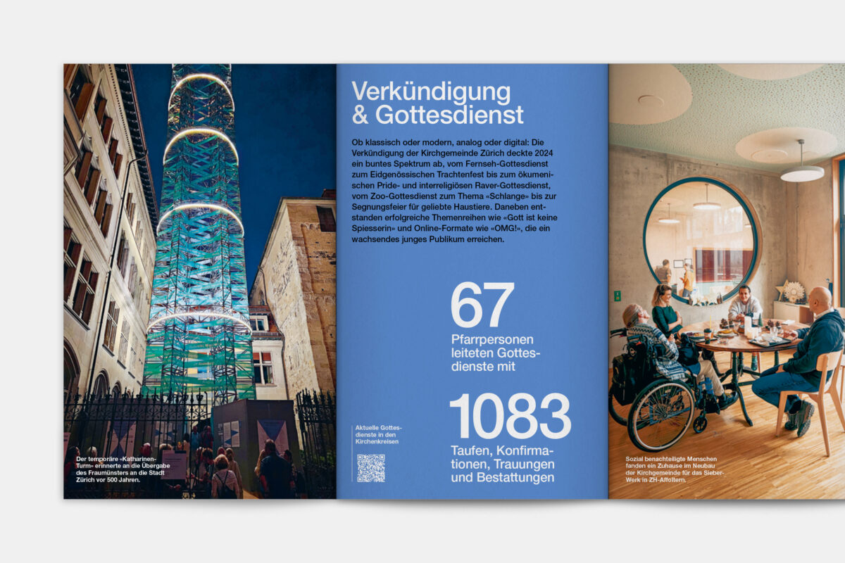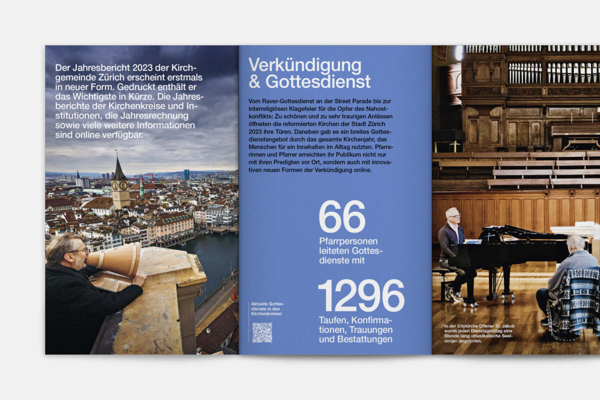 Für die Reformierte Kirche der Stadt Zürich war 2019 ein historisches Jahr. 500 Jahre nach dem Amtsantritt des Zürcher Reformators Ulrich Zwingli wurden die 32 Kirchgemeinden zu einer grossen Kirchgemeinde mit 12 Kirchenkreisen und fast 80’000 Mitgliedern zusammengelegt. In diesem Zug haben wir den Jahresbericht visuell neu konzipiert. Die Publikation lebt von einer typografisch klaren, offenen und zeitgemässen Gestaltungsanlage. Illustrationen der 41 Kirchen und Projekteinblicke aus den Kirchenkreisen vermitteln einen Eindruck der Vielfalt der neuen Kirchgemeinde Zürich.