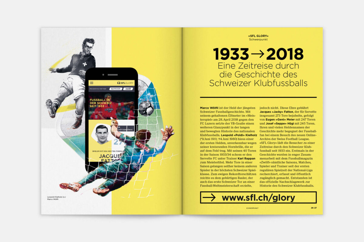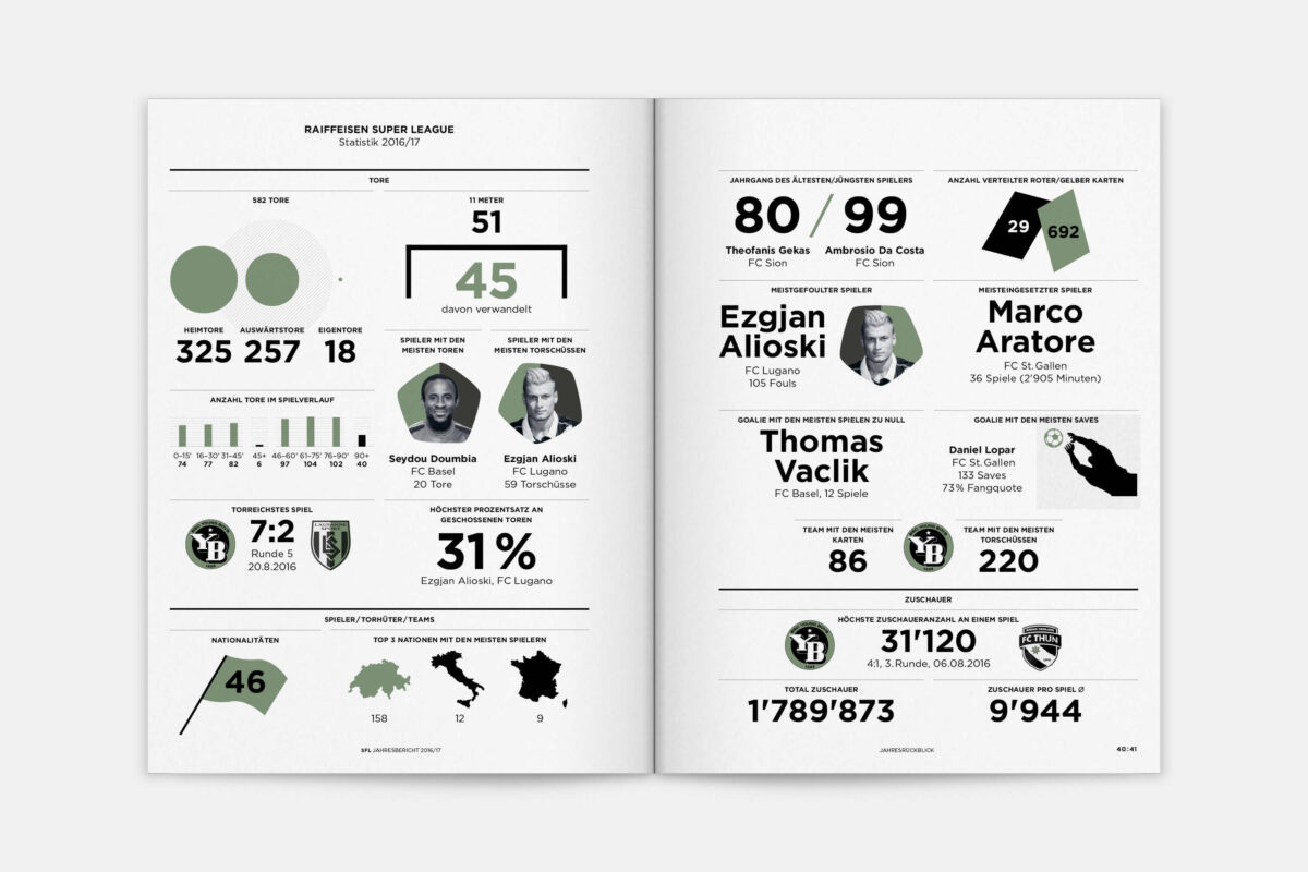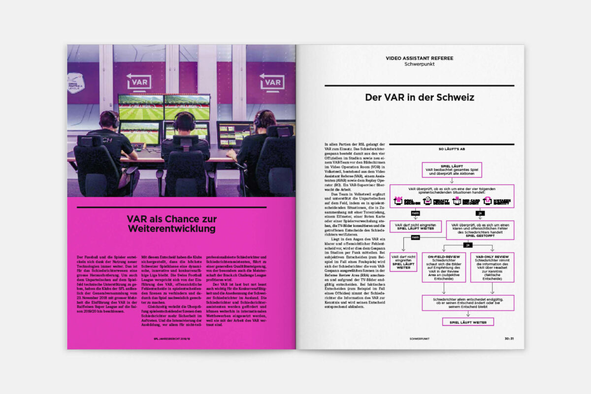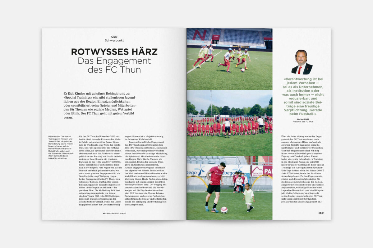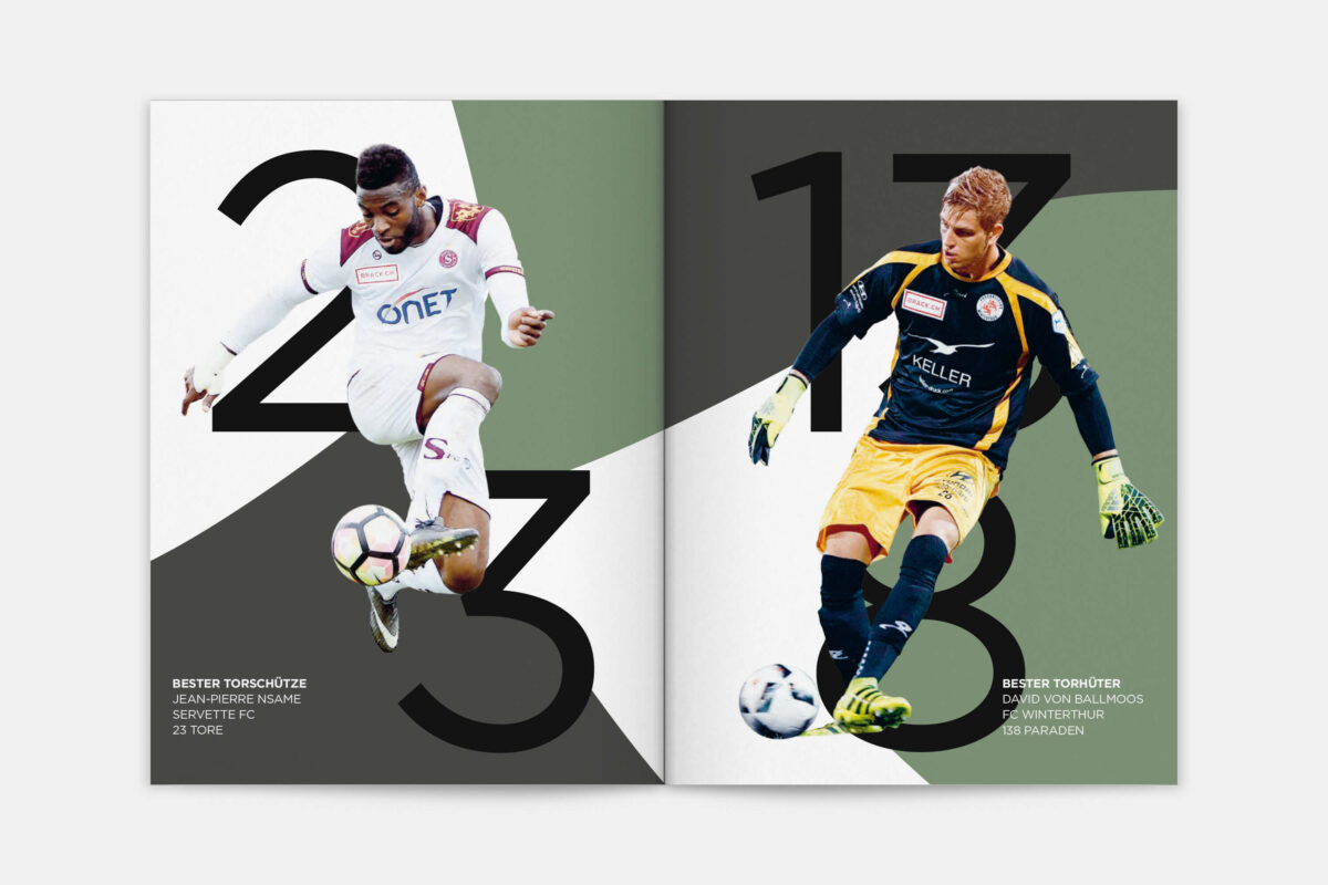 Der Jahresbericht der Swiss Football League richtet sich an Politiker:innen und Sportjournalist:innen, sowie an Vertreter:innen von Clubs und Verbänden. Sie alle sind auch Fussballfans und sie alle sollen den Bericht gerne lesen. 2015 haben wir die Publikation gemeinsam mit Nik Schwab inhaltlich und gestalterisch neu konzipiert und seither jährlich weiterentwickelt.