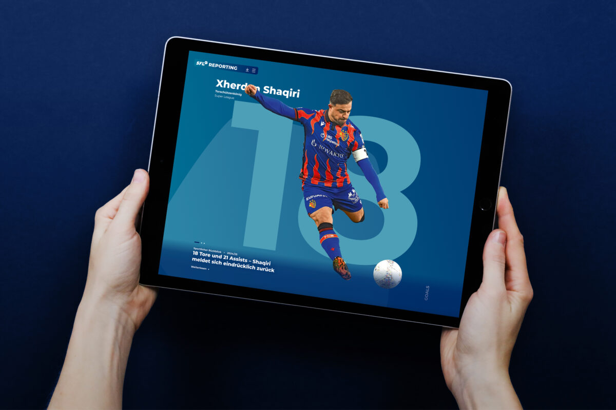 Seit 2018 publiziert die Swiss Football League ihren Jahresbericht auch als Microsite, seit 2021 erscheint er als reiner Online-Report mit Bewegtbild und animierten Kennzahlen.