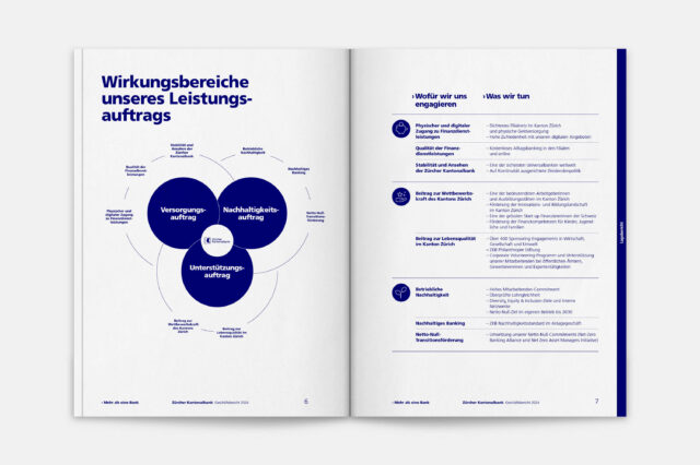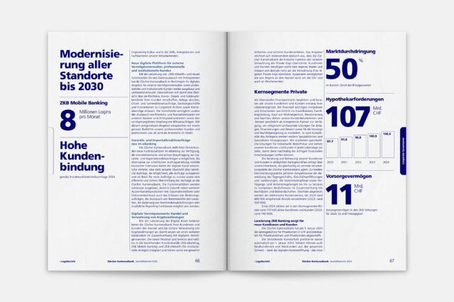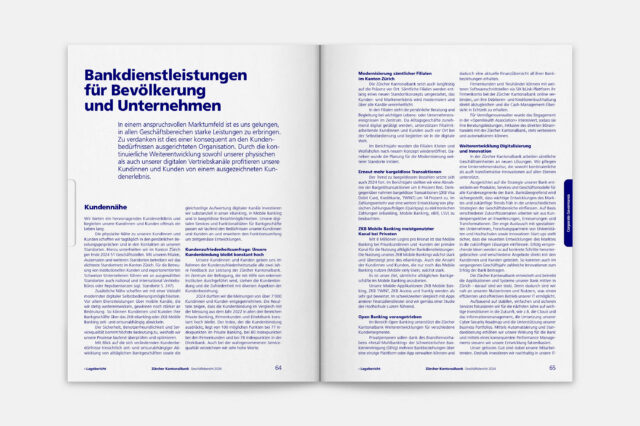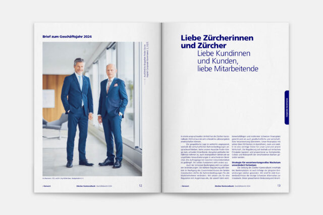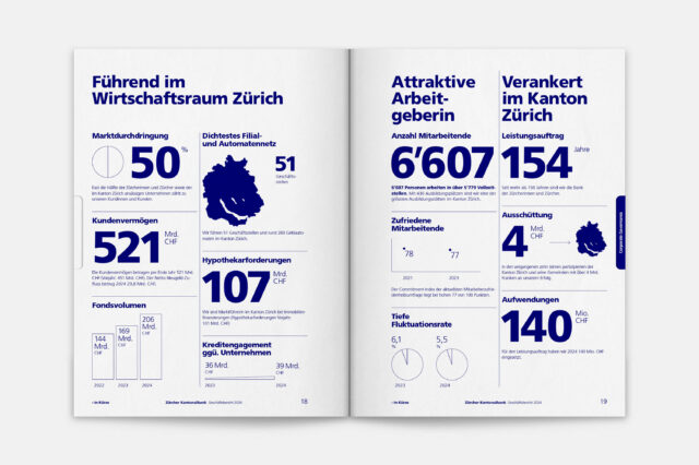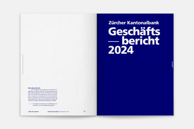 Seit 2024 verantworten wir die Gestaltung des Geschäfts- und Nachhaltigkeitsberichts der Zürcher Kantonalbank. Die umfangreichen Publikationen erscheinen als kleine Druckauflage in einem hochwertigen Schuber und als für die Arbeit am Bildschirm optimierte PDFs.
